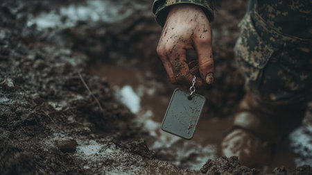 hand of a soldier holding dog tags in a trench, generative ai