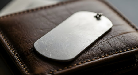 A blank silver dog tag lies on a brown leather wallet. The image is a close-up shot with a shallow depth of field.