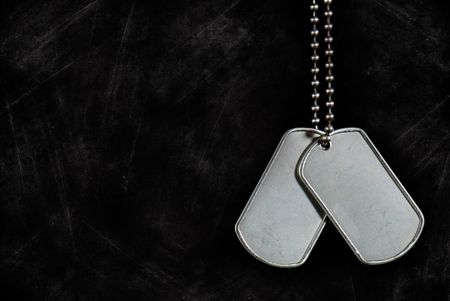 Dangling military dog tags on a grunge background.