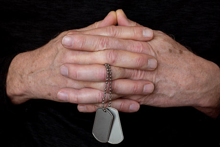 Close-up of man's hands folded in prayer and holding military dog tags on a chain