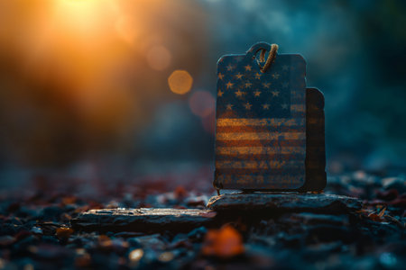 Rustic military dog tag with American flag design, symbolizing patriotism and honor, set against a dark, rough surface,