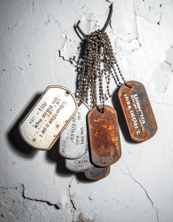 A collection of military dog tags, some new and others weathered by time and conflict, hang together as a poignant tribute. They represent generations of service, the weight of memory, and the enduring honor of those who have served. A powerful symbol of sacrifice, remembrance, and patriotism.