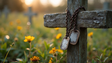 Memorial for fallen soldiers with dog tags on cross amid blooming wildflowers