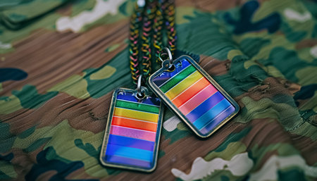 dog tags with rainbow pride flag designs on camouflage fabric, support for LGBTQ rights in military, blend of identity and service in a unique way. High quality photo