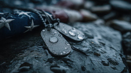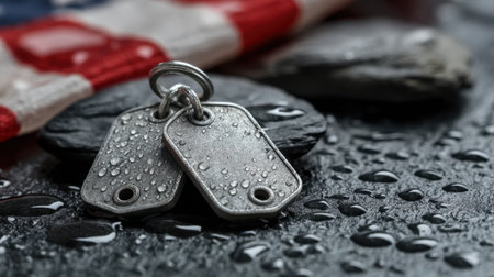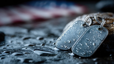This evocative image captures military dog tags placed on a wet surface next to an American flag, with glistening water droplets highlighting the scene's emotional depth.
