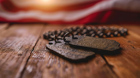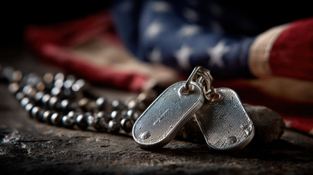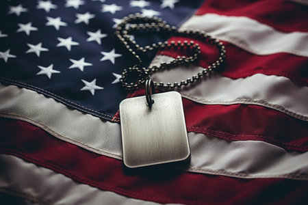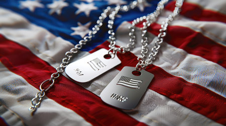 Dog Tags on American Flag, Military dog tags on the backdrop of the American flag, symbolizing the dedication and sacrifice of veterans for Veterans Day.