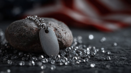 A solemn arrangement featuring a silver military dog tag on a smooth stone, surrounded by sparkling crystals, with a blurred patriotic flag adding depth and meaning.