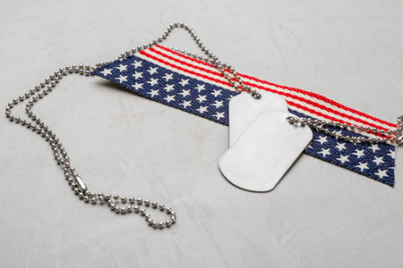 Military ID tags with USA flag on gray background