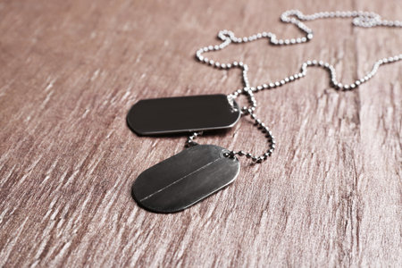 Blank military dog tags on old wooden background. Vintage style.