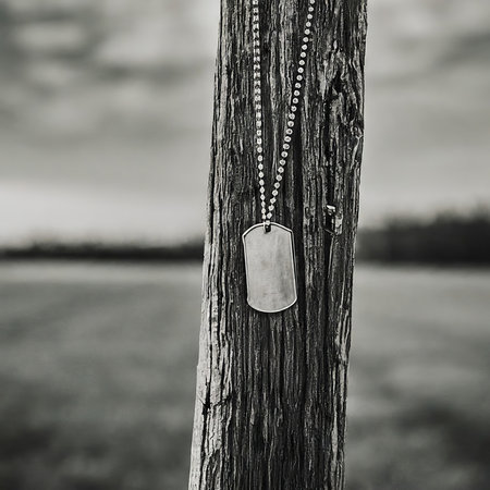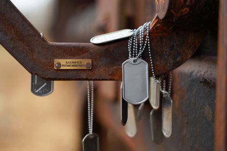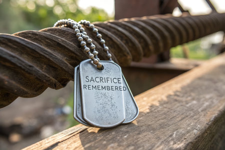 A poignant close-up of dog tags on weathered metal, symbolizing sacrifice and remembrance. A tribute at a memorial.