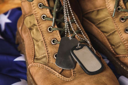 Military boots, tags and USA flag, closeup