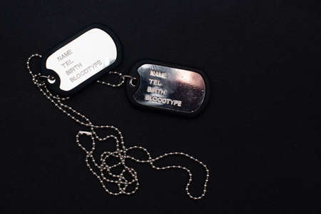 dog tag, army chains, army badge on the dark background.