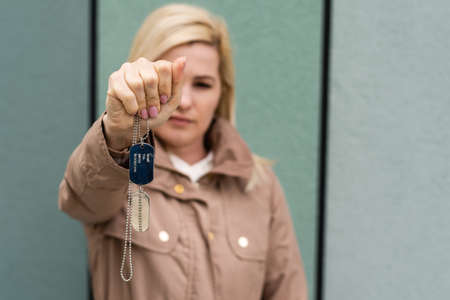 woman holding in hand military token
