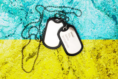 military ID tag and Ukrainian flag on background. Banner design