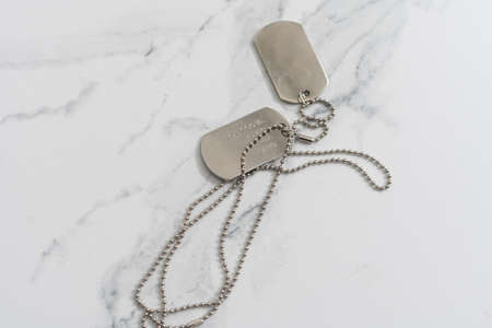 dog tag, army chains, army badge on the light background.