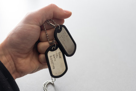blank army dog tags in hand on white background