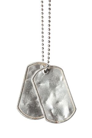 Military frayed dog tags with chains, on white background. Evoking memories of soldiers and sacrifice. War and conflict concept. Copy space.