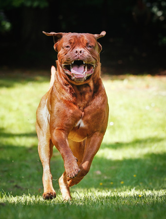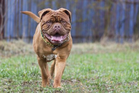 Dogue de Bordeaux dog runs on the grass in outdoor