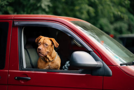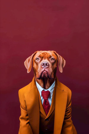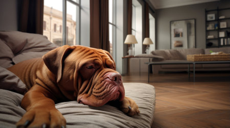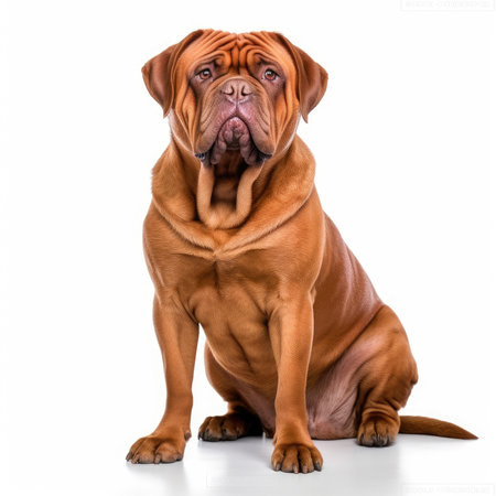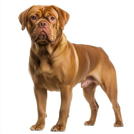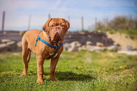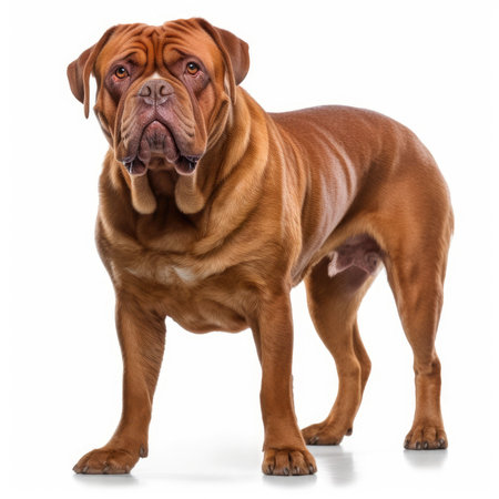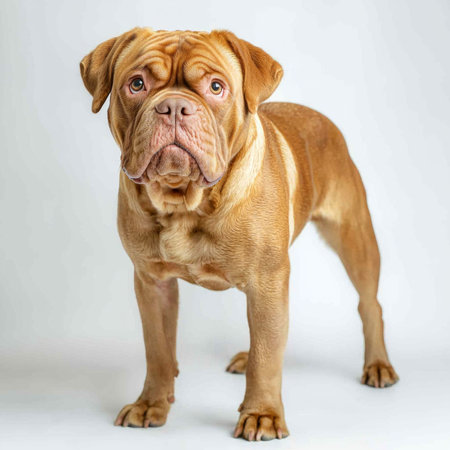 striking Dogue de Bordeaux stands proudly, displaying its large head and muscular build, exuding strength and charm in a captivating pose.
