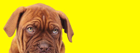 Lovely French Mastiff begging and making puppy eyes on yellow studio background