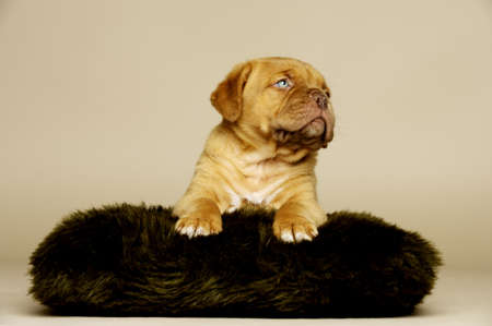 Cute dogue de boudeux puppy laid on a brown fluffy cushion on a cream beige background