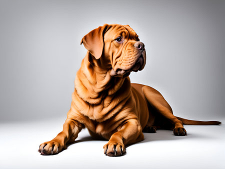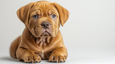 Dogue de bordeaux portrait with charming eyes and curious gaze against a minimalist gray background