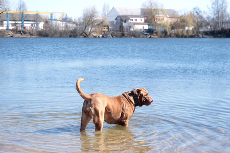 Happy big dog by the water. Playing in the water. French Mastiff. Bordeaux Great Dane. Best friend