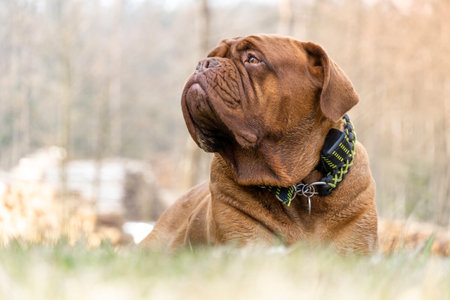 powerful Dogue de Bordeaux stands tall, showcasing its muscular build and large head. The striking features express a calm yet alert demeanor, embodying strength and loyalty.