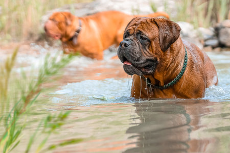 Two big dogs, Bordeaux Great Danes playing in the water. Two big dogs playing in the river