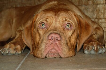 Sad Looking Brown Dog lays his head down on the floor to wait Dogue de Bordeaux