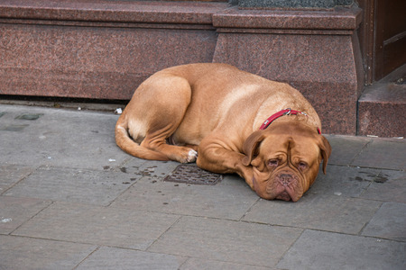Big Brown Dog with Sad Face laying down on the street beside a building