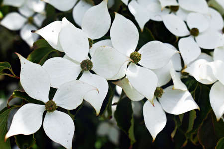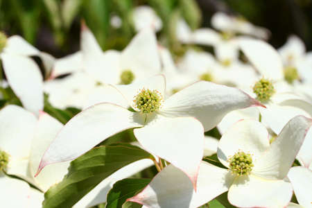 White flowers of Kousa Dogwood Tree, Cornus Kousa or Benthamidia japonica, in the park.