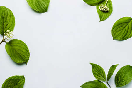 Beautiful green leaves frame on gentle blue background. Minimal summer floral pattern.