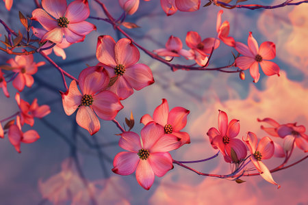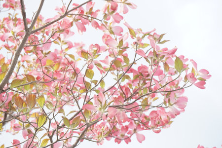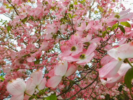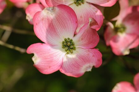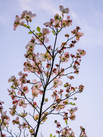 Flowering dogwood in spring. Floral display of delicate pink flowers under the sun.