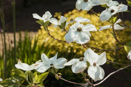 dogwood flowers in spring. Beautiful white Dogwood blossoms up close. Delicate natural beauty outdoors. Decorative flower bush in springtime.