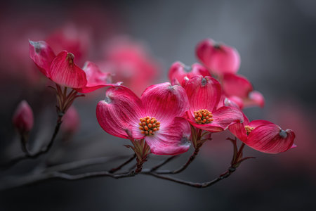 The Flowering dogwood in fall, warm amber light, crisp air, shallow depth of field, soft natural bokeh, true-to-life color, minimal styling