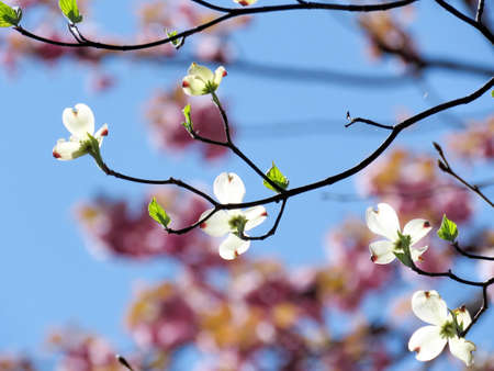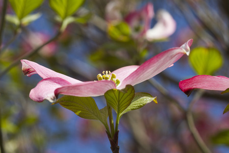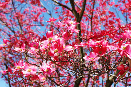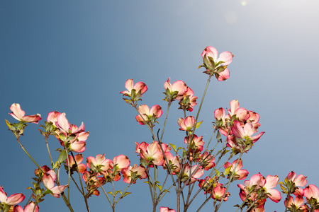 Branch of eastern pink dogwood trees in bloom in the spring with blue sky background