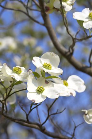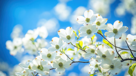Clusters of white dogwood flowers blooming on the branches of a tree, set against a bright blue sky, highlighting nature beauty in spring