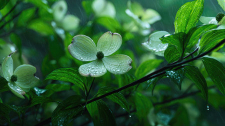 Dogwood in gentle light rain, soft raindrops visible on vivid green leaves, natural realistic style, bright fresh colors, balanced wide composition, cinematic framing, highly detailed, seamless for video continuation.