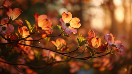 The Flowering dogwood at sunset, Golden red sunset light filters through the leaves, still atmosphere, warm orange glow blending with natural green tones.