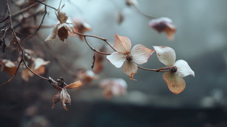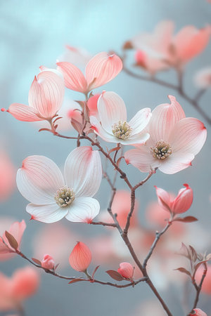 Nature showing delicate white dogwood blossoms with falling petals in soft focus springtime nature scene with...