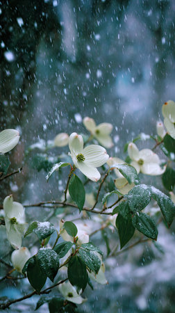 First snow falling gently on Dogwood, a few snowflakes drifting slowly and settling on the leaves; fresh air, natural.