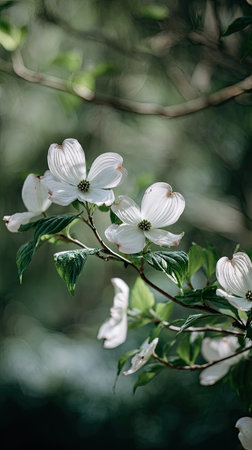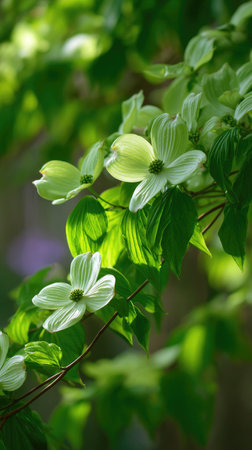 The Flowering dogwood in spring, fresh green leaves, soft sunlight filtering, vibrant atmosphere full of vitality, natural textures, serene mood P.