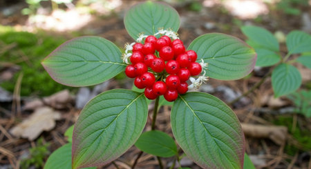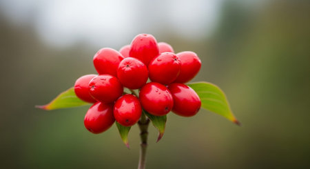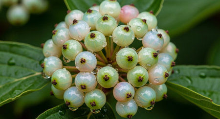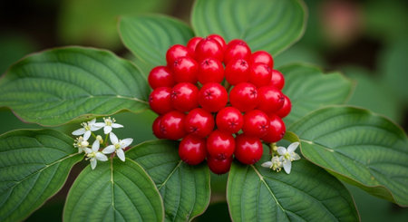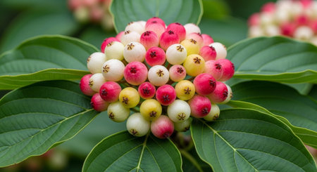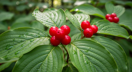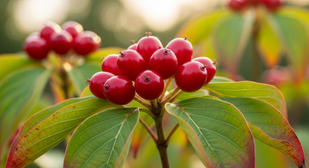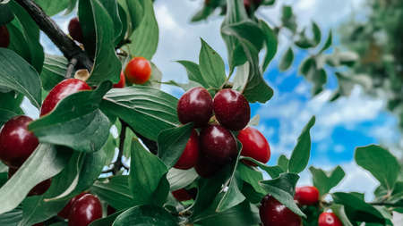Close-up of ripe dogwood fruit in clear summer weather. Gardening concept