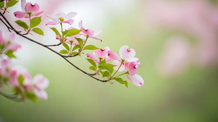 Close-up of a flowering tree branch showcases soft pink blossoms and vibrant green leaves. The composition features a shallow depth of field, with a blurred green backdrop. The scene evokes springtime and natural beauty. Suitable for use in various design projects and commercial applications.