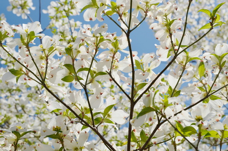 Looking down on a flowering dogwood branch with large white flowers opened up on a sunny day in early springtime