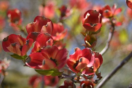 Macro shot of dogwood flowers outdoors. Focus on the left flower down