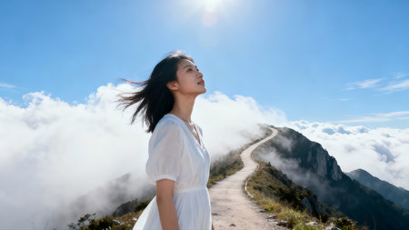 young happy and beautiful Asian Korean woman in white summer dress walking on mountain road enjoying beautiful view of clouds and blue sky enjoying holidays trip