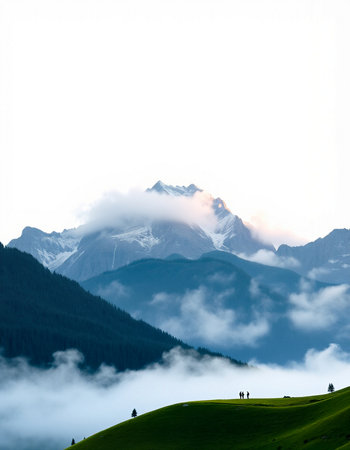 majestic mountain range shrouded in misty clouds, with snow-capped peaks visible, created with generative ai