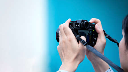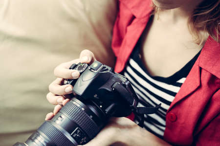 Close-up of woman hands holding professional DSLR camera and looking screen, Concept of creative work in photo studio.